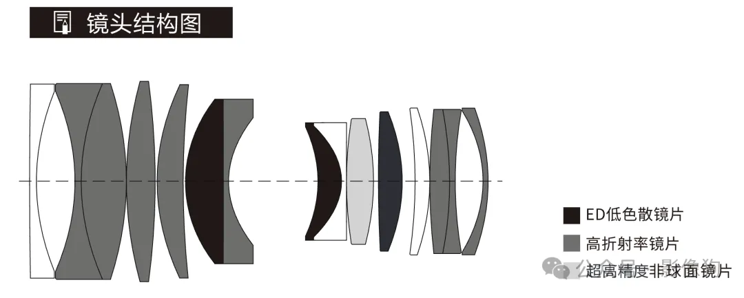 最後來看下鏡頭結構,有顏色的比沒顏色的多…堆料還是狠啊。 11組15片的結構,同時用上了1片超高精度非球、3片超低色散鏡片、8片高折射鏡片,它這個設計旨在保證低軸向色散的基礎上盡可能改善”洋蔥圈”等焦外問題。