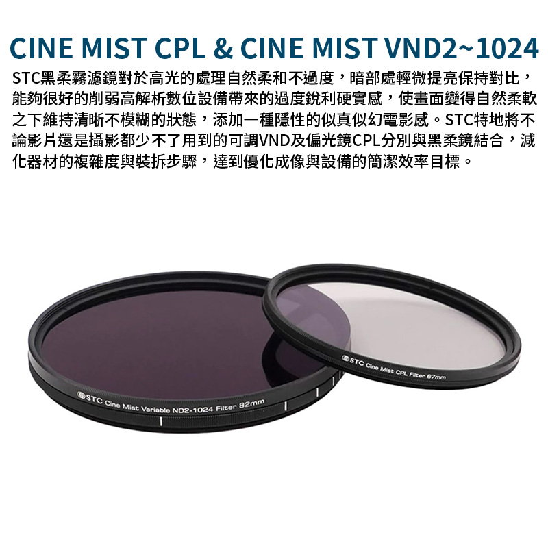 | 商品標準配備包含 | STC Cine Mist VND2-1024 1/4黑柔霧可調減光鏡*1 |