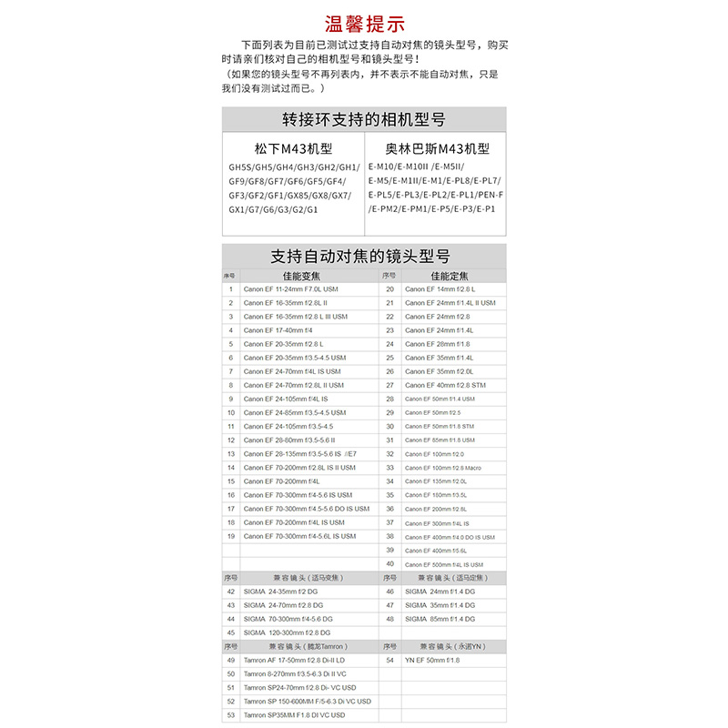| 商品標準配備包含 | Viltrox EF-M2-II(2代) M4/3自動對焦轉接環 增光減焦0.7X*1 說明書*1 |